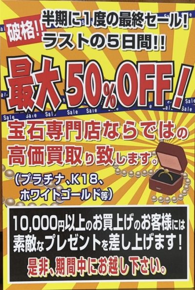 《半期に1度の最終セール!!》 8月26日(土)~30日(水) 最大50%OFF! 半期の1度の決算セール!ジュエリーをお得に手に入れるチャンス!! 高価買取致します。(K18、プラチナ、ホワイトゴールド等) ラスト5日 […]